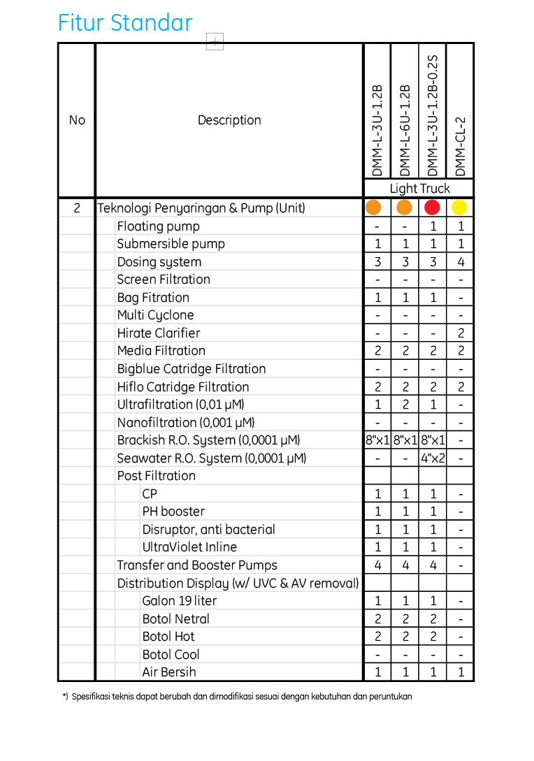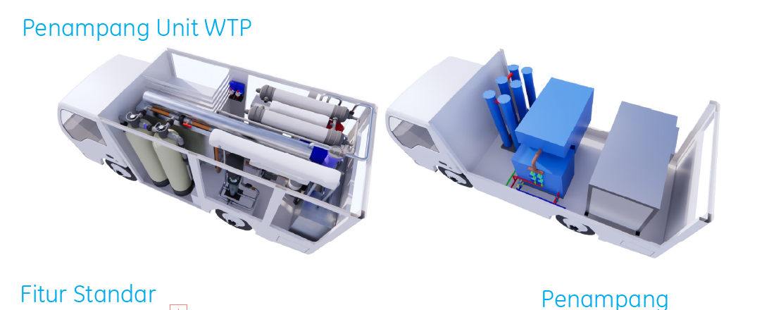 Mobil Water Treatment Plant (Mobil Penyaring Air Menengah) dengan ukuran menengah yang mampu melalui wilayah-wilayah sempit  dengan kemampuan pilihan penyaringan dari air payau hingga laut dengan kemampuan yang lebih besar. sistem middle mobile WTP ini Juga dilengkapi pilihan pengoperasian secara manual hingga otomasi PLC (Programme Logic Control), juga dilengkapi pilihan sistem penyaraingan clarifier.